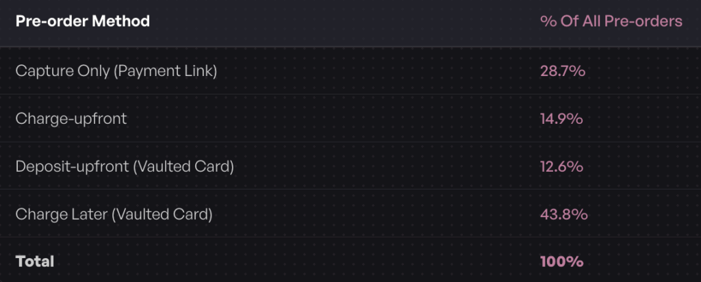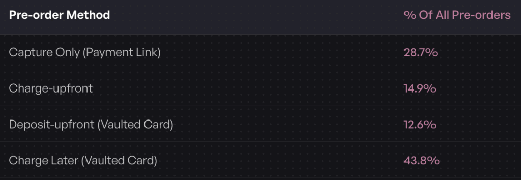 According to our data, 12.6% of pre-orders use the deposit-upfront vaulted card method. This approach works particularly well for higher-ticket items ($300+) where full upfront payment feels like too much commitment, but a deposit demonstrates serious buyer intent.