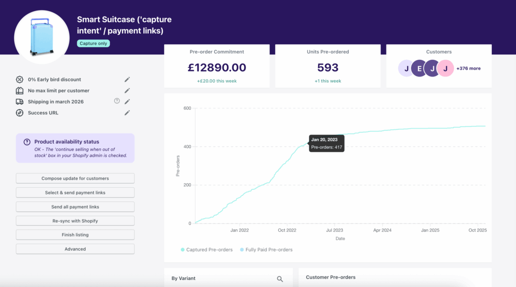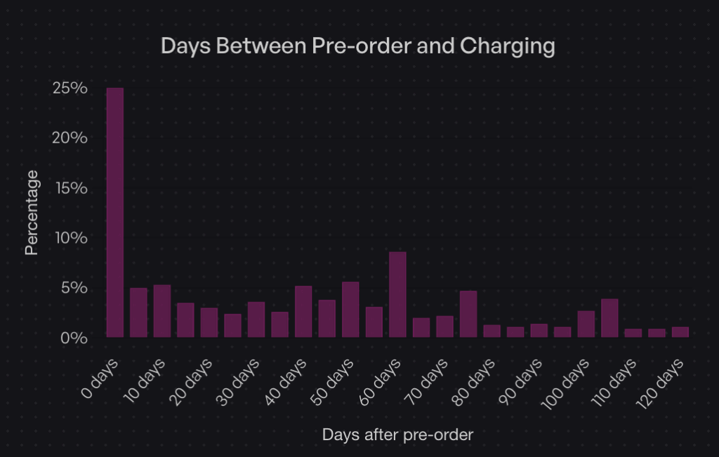 With 31.6% of pre-orders having 121-150 day lead times, managing expectations becomes crucial. Charge-later significantly reduces friction by not taking money until closer to ship date.