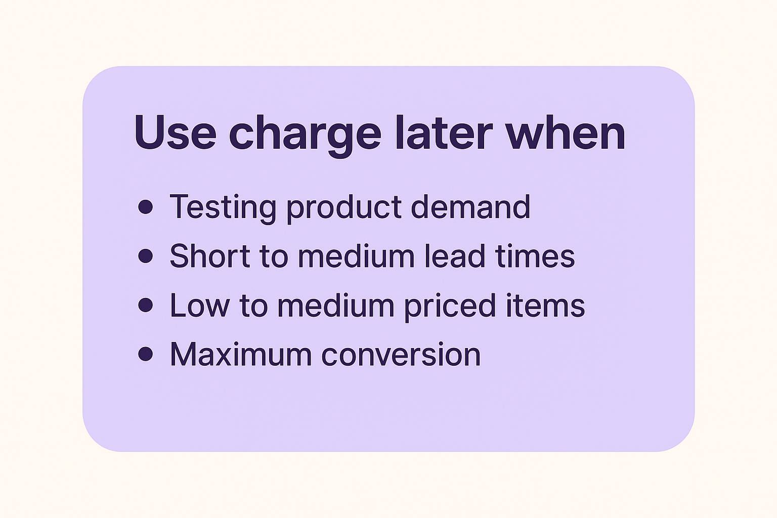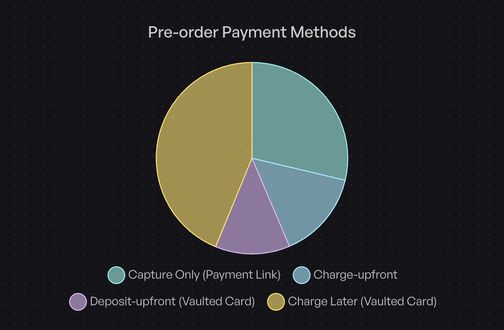 When lead times are short, charge-upfront works well. Our data shows 18.4% of pre-orders ship within 30 days. Customers are more comfortable paying upfront when they know they’ll receive the product quickly.
