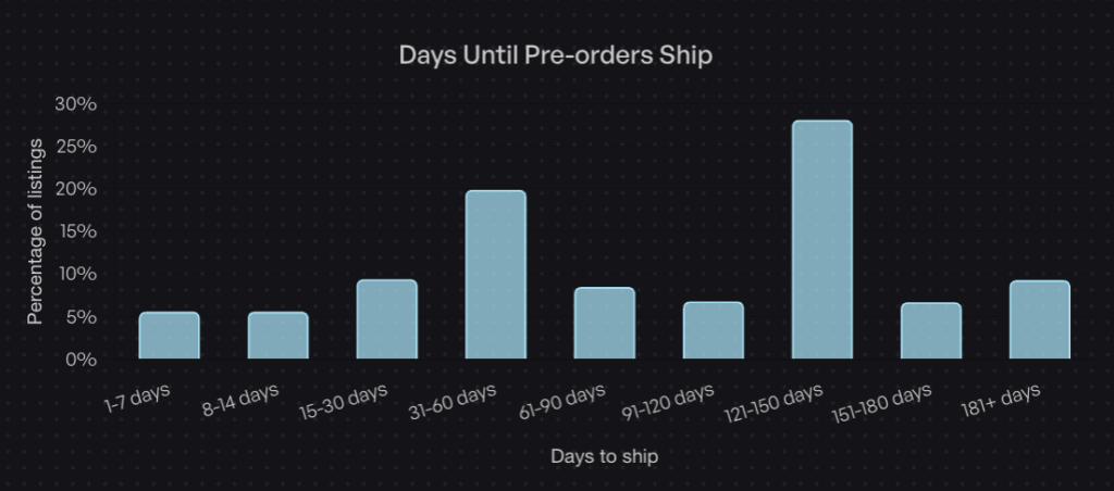 Our data shows that 31.6% of pre-orders have 121-150 day lead times, with 18.4% shipping within 30 days. The length depends on your production timeline and customer patience. For crowdfunding-style launches, 30-60 day campaigns create urgency. For traditional pre-orders, align your timeline with your actual production and shipping schedule.