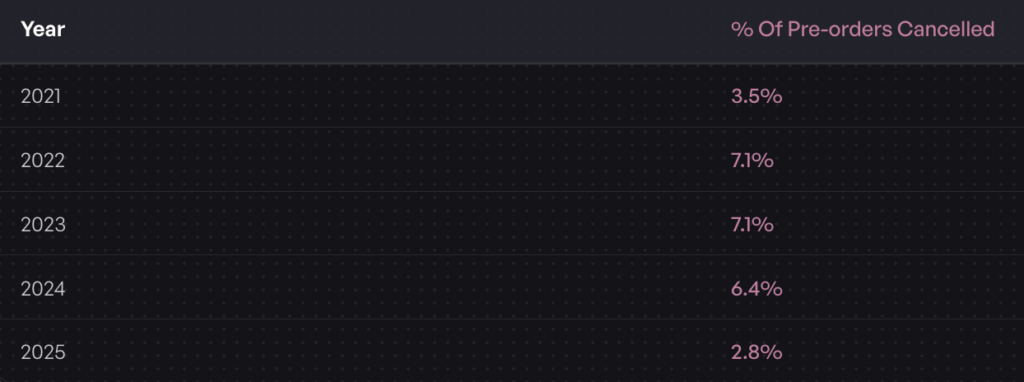 How you charge matters more than most brands realize. Our data shows that 43.8% of pre-order listings use charge-later methods, where customers provide payment details but aren’t charged until the product ships. This significantly reduces friction for long lead times.