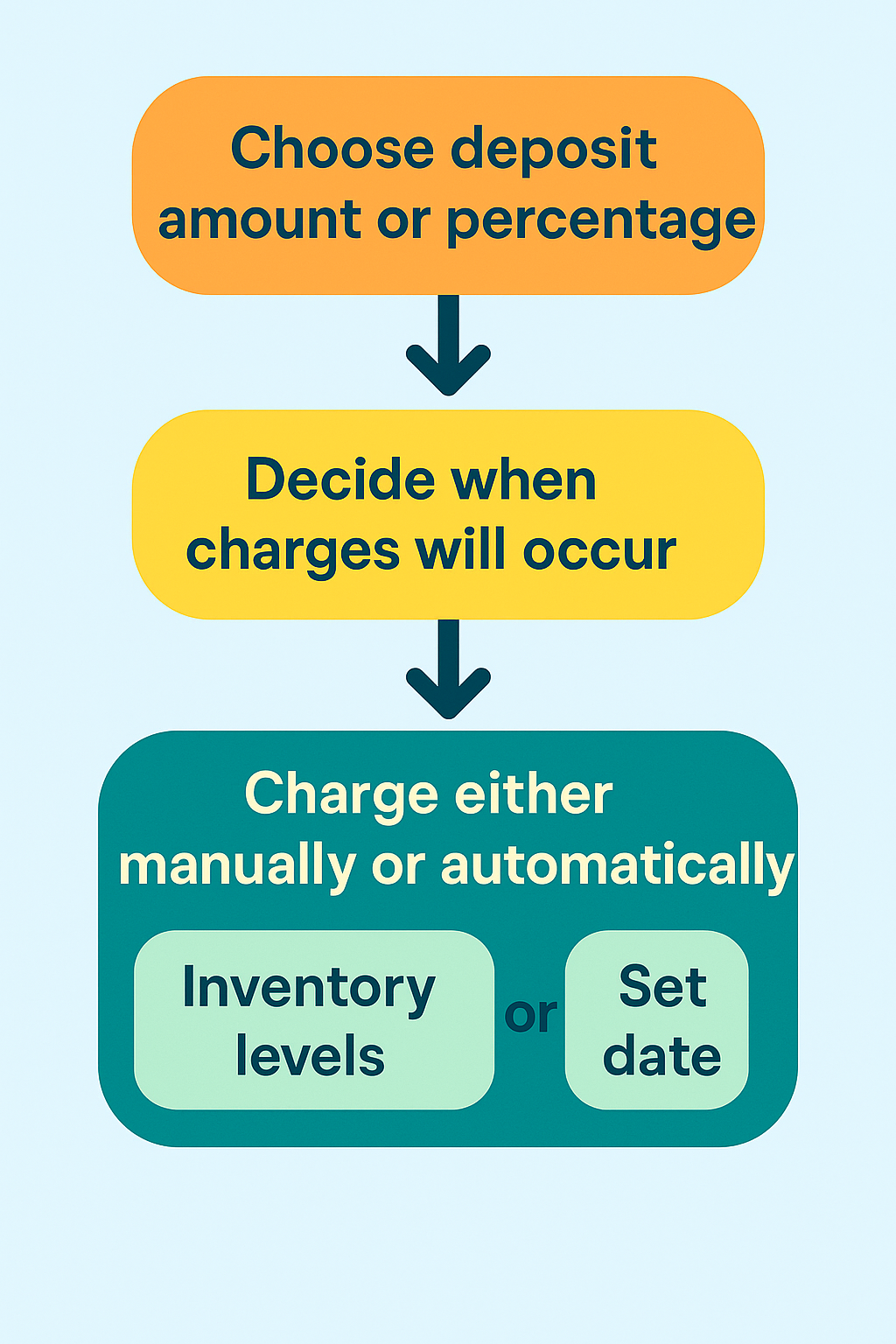 The key is testing your flow before going live. Place test orders to verify everything works as expected, especially if you’re using deposits or charge-later functionality.