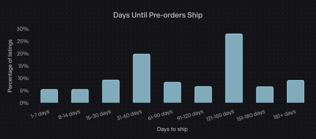 28.1% of pre-orders ship within 121-150 days, making four to five months the most common window. But plenty of successful campaigns run shorter (30-60 days) or longer (180+ days).