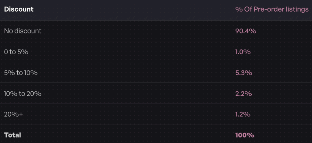 Here’s a surprise: 90.4% of pre-orders have no discount applied. Pre-orders already offer early access value. You don’t need to discount to drive demand.