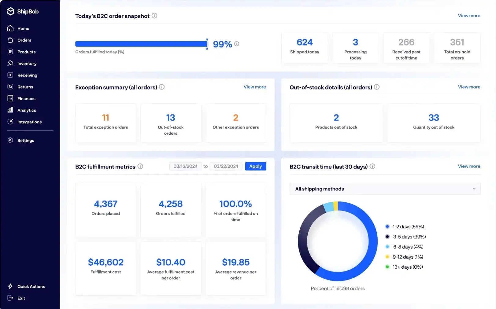 • Real-Time: As soon as an order is placed, ShipBob receives it